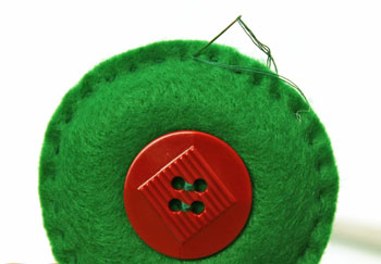 Take the needle to the back of the button wreath ornament and tie a knot near the felt but don't cut the thread.