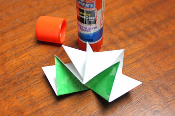 Put glue on the face of one of the small squares and glue a second small square on top of it making sure the points and edges match.
